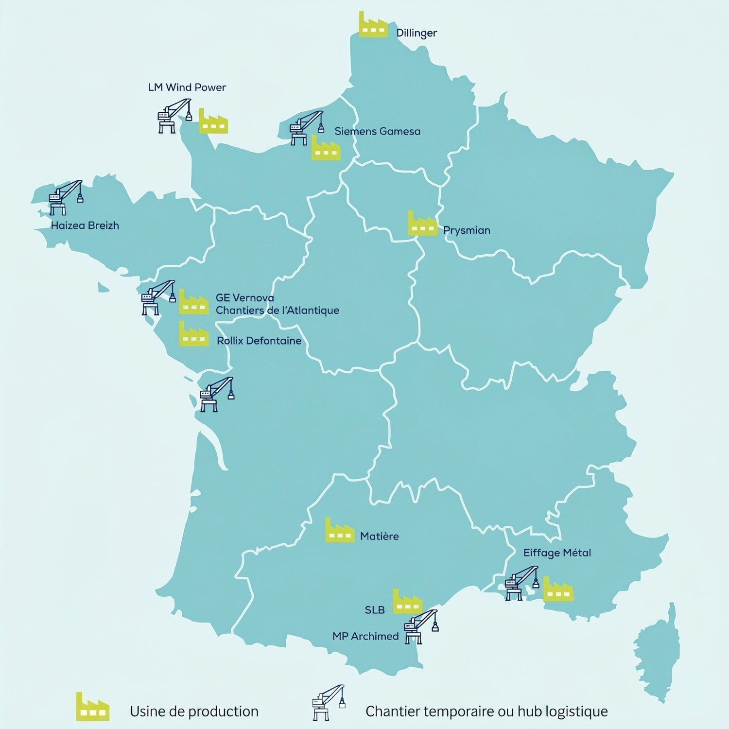 : usines de pales, nacelles et sous-stations électriques (source : France Renouvelables) ↩︎ - Fin 2024, 5 entreprises industrielles représentaient 52% de l’emploi et 80% du chiffre d’affaires déclaré par les prestataires, fournisseurs et sous-traitants de la chaîne de valeur (chiffres de l’OEM) ↩︎